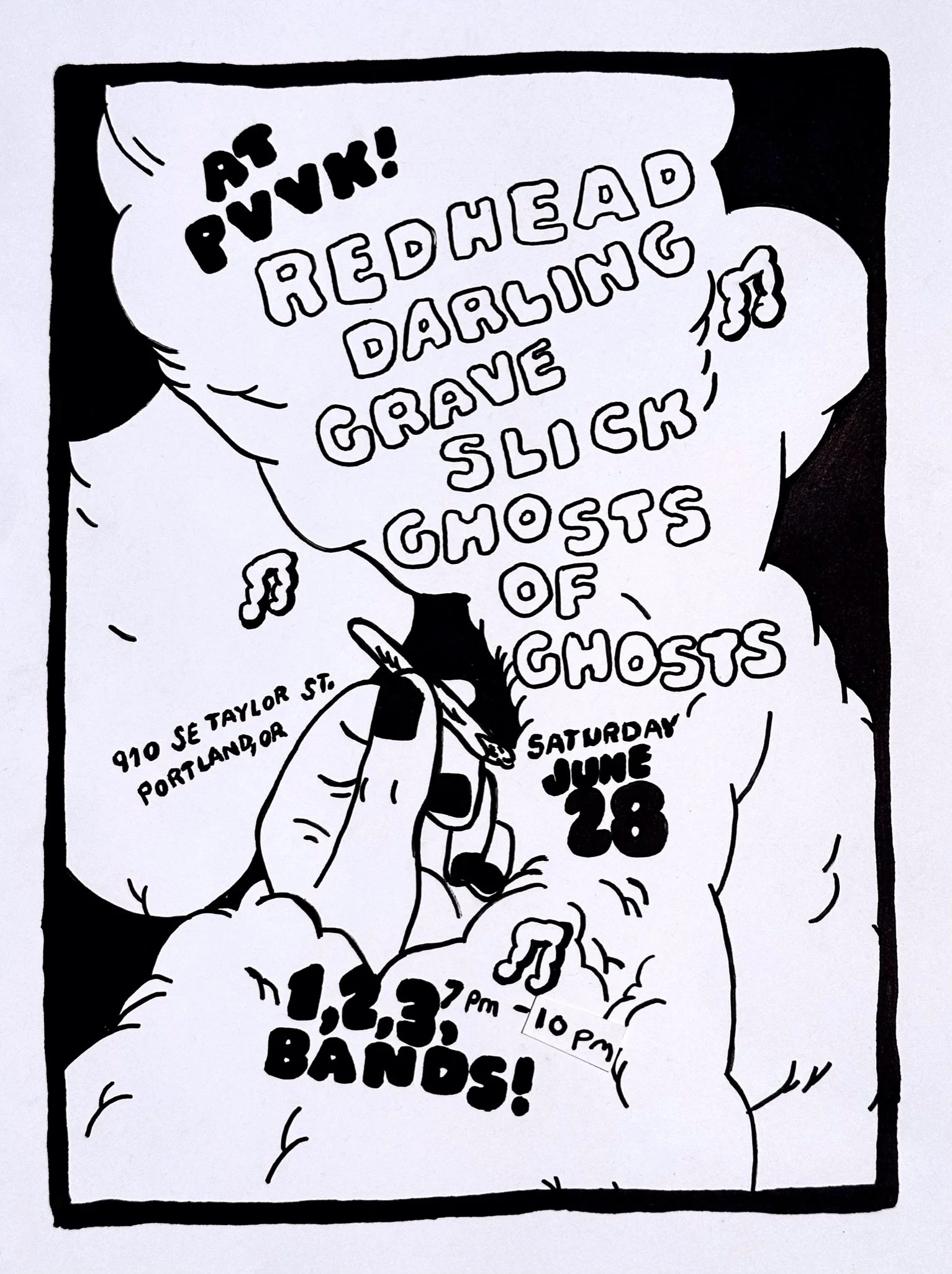 Join us for live music at the art studio, featuring Redhead Darling, Grave Slick, and Ghosts of Ghosts